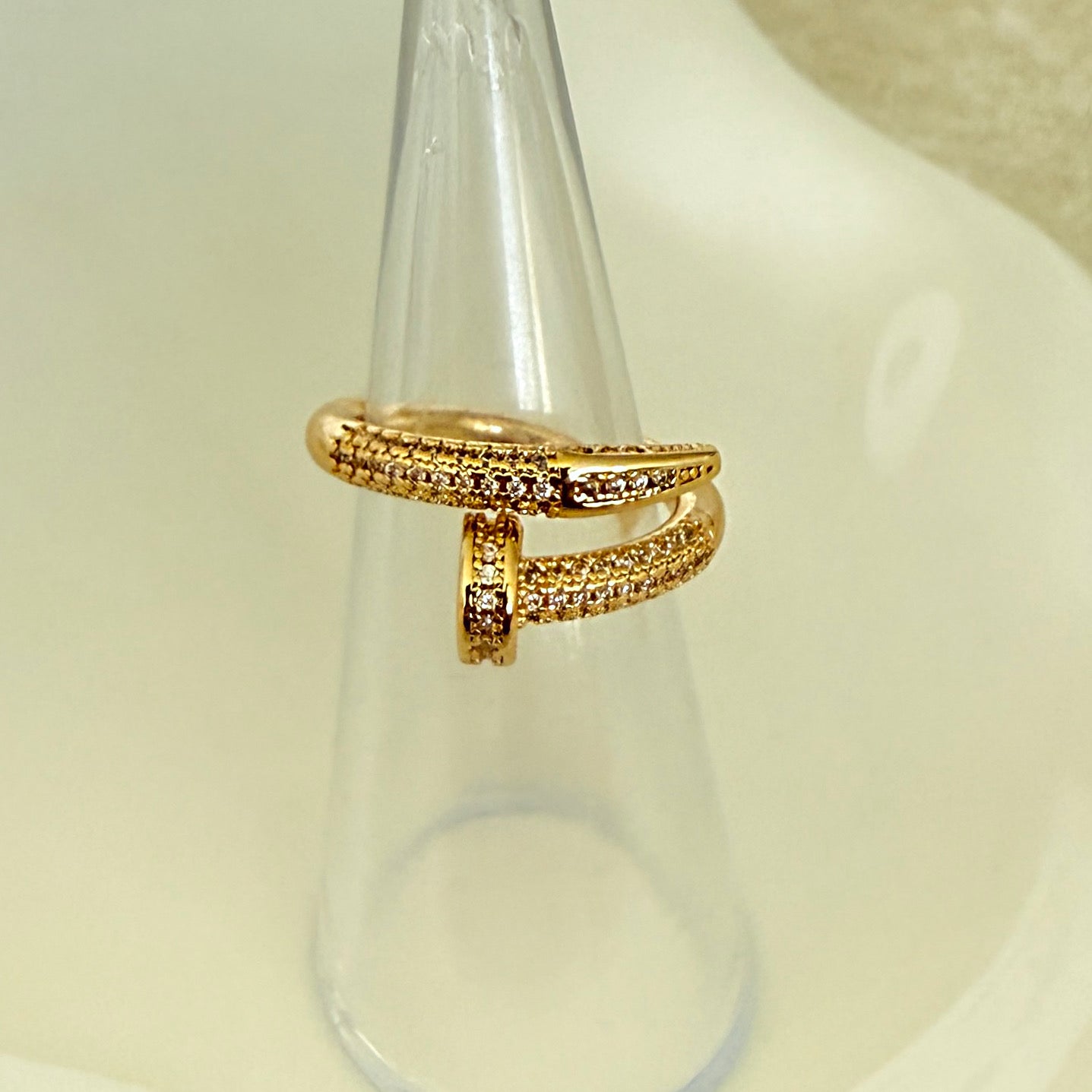 The Parisa ring is fully adorned with sparkling stones, creating a dazzling effect that catches every eye. Designed to resemble the elegance of a perfectly manicured nail ring, this ring adds a unique and stylish touch to your look.