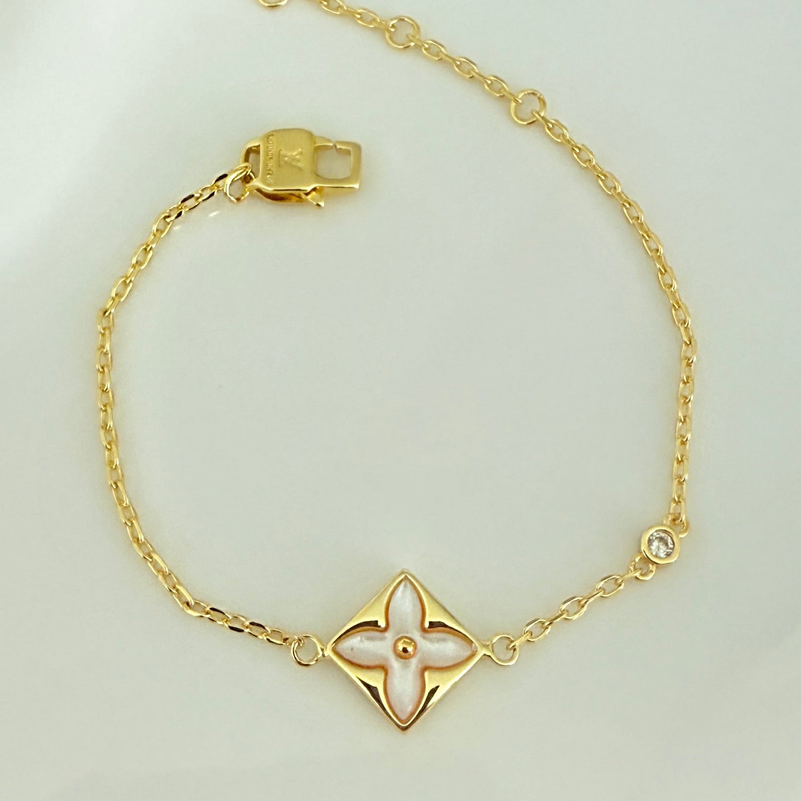 The Avi bracelet features a delicate white flower design that adds a touch of elegance to any outfit. Its subtle charm makes it perfect for daily wear or special occasions, offering a graceful accessory that complements your style with gentle beauty.