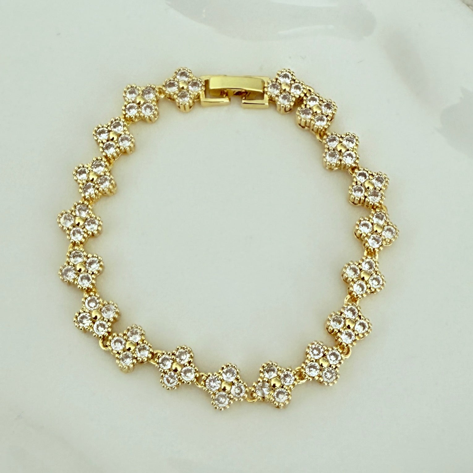 Elevate your style with the Kendall bracelet, exquisitely adorned with an array of sparkling stones arranged in delicate floral patterns. This full-stoned design captures light beautifully, adding a touch of elegance and glamour to any outfit.